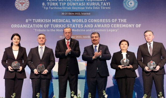 Cumhurbaşkanı Erdoğan, 8. Türk Tıp Dünyası Kurultayı kapsamında Nobel Ödüllü Türk bilim insanı Prof. Dr. Aziz Sancar adına bu yıl 6.'sı verilen 2022 TÜSEB ödüllerini de sahiplerine verdi.İSTANBUL (İGFA) - Cumhurbaşkanı Erdoğan, Hilton Bosphorus Hotel'de gerçekleştirilen 8. Türk Tıp Dünyası Kurultayı ve Tıp Tarihine/Ortak Geçmişe Vefa Ödül Töreni'nde, katılımcıları selamlarken, toplantının tıp dünyası ve insanlık için hayırlara vesile olmasını diledi.Cumhurbaşkanı Recep Tayyip Erdoğan, "Dünyanın artık sadece siyasi ve ekonomik olarak değil aynı zamanda doğrudan insanın varoluş gayesiyle ilgili de arayışlar içerisinde olduğu bir dönemde 'Türkiye Yüzyılı' hepimiz için deniz feneri mahiyetinde bir rehber olacaktır." dedi.İletişim Başkanlığı'ndan aktarılan habere göre, 2022 TÜSEB Aziz Sancar Bilim Ödülü'ne Koç Üniversitesi Öğretim Üyesi Prof. Dr. İbrahim Halil Kavaklı, 2022 TÜSEB Hizmet Ödülü'ne Marmara Üniversitesi Öğretim Üyesi Prof. Dr. Ahmet Oğuzhan Özen, 2022 TÜSEB Özel Ödülü'ne Erciyes Üniversitesi Öğretim Üyesi Prof. Dr. Aykut Özdarendeli layık görüldü.2022 TÜSEB Teşvik Ödülleri ise Penn State ve Çukurova Üniversitesi Öğretim Üyesi Prof. Dr. İbrahim Tarık Özbolat, Adnan Menderes Üniversitesi Öğretim Üyesi Prof. Dr. Özge Çevik, Koç Üniversitesi Öğretim Üyesi Doç. Dr. Sedat Nizamoğlu, Erciyes Üniversitesi Öğretim Üyesi Doç. Dr. İsmail Öçsoy, Hacettepe Üniversitesi Öğretim Üyesi Doç. Dr. Tunca Doğan'a verildi.Törende ayrıca Türk Devletleri Teşkilatı (TDT) üyesi ülkelerin Sağlık Bakanları, ülkelerindeki sağlık çalışanları adına ödüllerini Cumhurbaşkanı Erdoğan'ın elinden aldı.Cumhurbaşkanı Erdoğan daha sonra Health Türkiye standını gezerek, bilgi aldı.