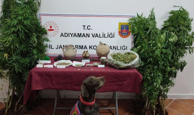 2 adet Lyrıca sentetik hap, 1 adet esrar öğütme aparatı, 9 adet eski dönemlere ait sikke, 3 adet eski dönemine ait testi, 2 adet eski dönemlere ait hançer, 1 adet 7.65 Blow marka ruhsatsız tabanca ele geçirildi.Şüpheli şahıs yakalanarak gözaltına alınırken, olayla ilgili tahkikat başlatıldı.