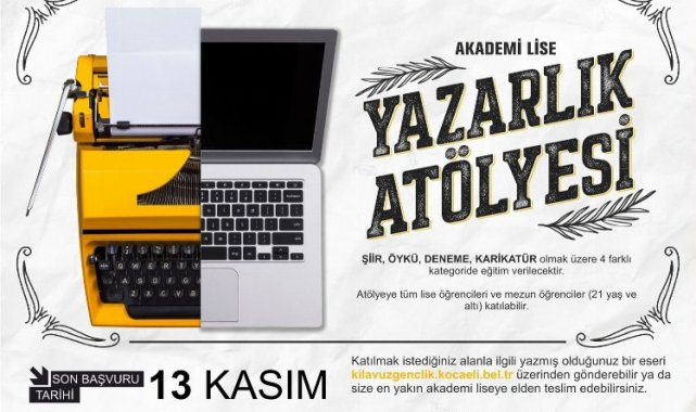 Kocaeli Büyükşehir Belediyesi'ne bağlı Akademi Liselerde, Yazarlık Atölyesi için yeni dönem başvuruları başlıyorKOCAELİ (İGFA) - Geleceğin teminatı gençler için sanattan spora, eğitimden kültüre birçok alanda başarılı çalışmalara imza atan Kocaeli Büyükşehir Belediyesi, "Akademi Lise Yazarlık Atölyesi" için kayıt almaya başlıyor. Bu yıl 7'incisi düzenlenecek atölye eğitimlerinin sonunda gençlerin kaleme almış olduğu eserlerden oluşan ''Yazarlık Atölyesi Seçkisi'' kitabı basılarak okuyuculara sunulacak. Başvurular https://kilavuzgenclik.kocaeli.bel.tr/AkademiLise/YazarlikOkulu.aspx adresi üzerinden yapılabilecek. Son başvuru tarihi ise 13 Kasım 2022 olarak belirlendi.18 HAFTA SÜRECEKKocaeli Büyükşehir Belediyesi Gençlik ve Spor Hizmetleri Dairesi Başkanlığı'na bağlı Akademi Liseler tarafından 19-20 Kasım'da başlatılacak olan atölyeler, 8-9 Nisan'da 18 haftayı tamamlayarak sona erecek. Mayıs ayında yapılması planlanan Kocaeli Kitap Fuarı'nda ise final programı ve kitap tanıtımı yapılacak.YAZARLIK ATÖLYESİ'NDE EĞİTİMLER"Akademi Lise Yazarlık Atölyesi'nde ilk dersler, Portre (Biyografi) türünde Proje Koordinatörü Fahri Tuna, Hikâye (Öykü) türünde Güray Süngü, Deneme türünde Mehmet Şeker, Karikatür ve Şiir türünde ise İlhami Atmaca tarafından verilecek. İzmit ve Gebze bölgesi başta olmak üzere çeşitli ilçe akademilerinde verilecek olan eğitimlere düzenli olarak devam eden öğrencilere süreç içinde alanlarına yönelik 5 kitap hediye edilecek.