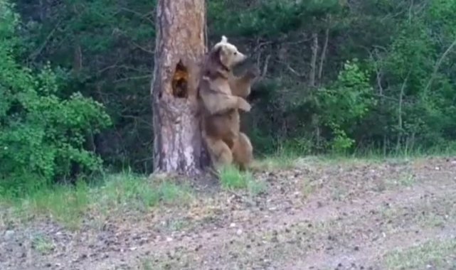 Doğa Koruma ve Milli Parklar Genel Müdürlüğü, yaban hayvanlarının doğal davranışlarına saygı olarak ayıların kaşınma ağaçlarını güvence altına aldı. Milli Parklar sosyal medya hesabından yaptığı paylaşımda, ayıların ormanda kaşınma dansını bu görüntülerle paylaştı.