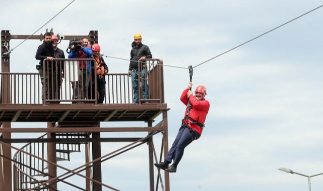 Sanayi ve Teknoloji Bakanı Mustafa Varank, Osmangazi Belediyesi'nin Macera Bursa parkını gezerek adrenalin tutkunlarının heyecanına ortak oldu.BURSA (İGFA) - Sanayi ve Teknoloji Bakanı Mustafa Varank, Hamitler Mahallesi'ndeki Macera Bursa'da ekstrem spor tutkunlarının vazgeçilmezleri olan zipcoaster, zipline, serbest düşüş, tırmanma duvarı ve macera ip parkurlarını inceledi.Tesisteki vatandaşlarla sohbet eden Varank, görevlilerden parkurlar hakkında bilgi aldıktan sonra kaskını takarak zipline kulesine çıktı. Vatandaşların alkışları eşliğinde kendisini hat üzerinde Bursa manzarasına doğru boşluğa bırakan Bakan Varank, keyifli anlar yaşadı. Osmangazi Belediye Başkanı Mustafa Dündar da Bakan Varank'ın zipline deneyimine eşlik etti.