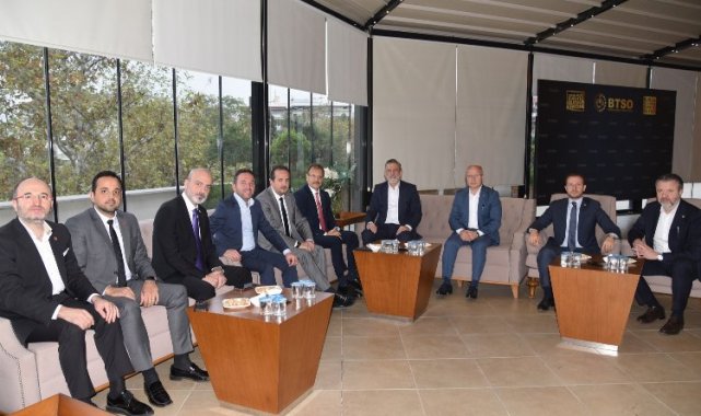 AK Parti Bursa İl Başkanı Davut Gürkan, beraberinde Bursa Milletvekilleri ile geçtiğimiz günlerde yapılan seçimler sonucunda görevini sürdüren BTSO Başkanı ve yönetim kuruluna 'hayırlı olsun' ziyaretinde bulundu.BURSA (İGFA) - Bursa Ticaret ve Sanayi Odası'nın (BTSO) Altıparmak'ta bulunan hizmet binasında gerçekleşen ziyarete AK Parti Bursa Milletvekili ve TBMM İnsan Haklarını İnceleme Komisyonu Başkanı Hakan Çavuşoğlu, AK Parti Bursa Milletvekilleri Refik Özen, Ahmet Kılıç, Zafer Işık, Vildan Yılmaz Gürel ve AK Parti Bursa il yürütme ve yönetim kurulu üyeleri katıldı.Ziyarette konuşan AK Parti Bursa İl Başkanı Davut Gürkan, Türkiye'nin en büyük ticaret ve sanayi odalarından olan BTSO yönetimine yeni dönemde başarılar diledi.Dinamik ve üretken nüfus yapısı, ekonominin bir çok alanındaki potansiyelleri ve farklı sektörlerdeki üretim, ticaret ve ihracat rakamları ile Bursa'nın, Türkiye'nin lokomotifi konumunda olduğunu vurgulayan Başkan Gürkan, BTSO'nun ve Bursalı sanayicilerin öncü çalışmaları ile geleceğe emin adımlarla yürüdüğünü belirtti.Geçtiğimiz dönemdeki vizyoner çalışmaları ile Bursa iş dünyasının güvenini kazanan İbrahim Burkay ve yönetiminin yeni dönemde de aynı ivme ile yoluna devam edeceğine olan inancını dile getiren Gürkan, "Tüm potansiyelleri ile yalnızca ülkemizin değil bölgemizin ve dünyanın güzide şehirlerinden olan Bursamızı her alanda kalkındırmak adına tüm kurumlarımızla olduğu gibi BTSO ile fikir ve iş birliklerimiz sürecektir. Bursamızın hep birlikte güçlü geleceğine taşıyacağız" dedi.
