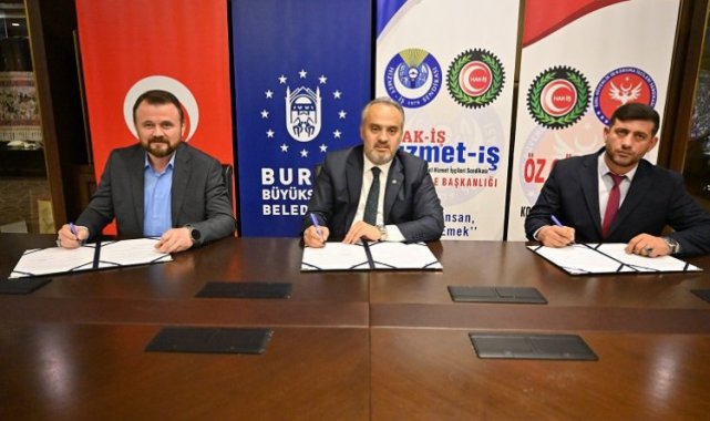 Bursa Büyükşehir Belediyesi'nde yaklaşık 13 bin personeli ilgilendiren banka promosyonuyla ilgili süreç tamamlandı. Buna göre, Yapı Kredi Bankası ile 27 bin TL'ye anlaşma sağlandı. Eski banka ile sözleşmeden kaynaklanan 5 bin 500 TL'lik cayma bedeli düşüldüğünde, her personelin cebine 21 bin 500 TL girmiş olacak.BURSA (İGFA) - Bursa Büyükşehir Belediyesi iştiraklerinden BİNTED'de çalışan 5100 işçiyi ilgilendiren toplu sözleşme ek protokolü BİNTED A.Ş. ile Hizmet-İş ve Özgüvensen Sendikaları arasında imzalandı. Protokol kapsamında, 14 Mart 2024 tarihine kadar yürürlükte olacak olan toplu iş sözleşmesinin; 15 Eylül 2022 tarihinden itibaren yüzde 26,97 enflasyon oranında iyileştirilen ücret maddelerine ilaveten bazı maddelerinde de iyileştirme sağlandı. Ek protokol imza töreninde konuşan Bursa Büyükşehir Belediye Başkanı Alinur Aktaş, "Yemek ücreti nakit olarak ödenmek üzere