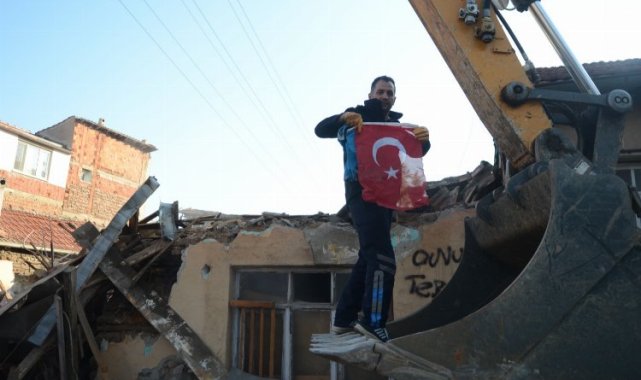 Bursa'da Osmangazi Belediyesi tarafından Küplüpınar Mahallesi'nde gerçekleştirilen metruk bina yıkımı esnasında çatıda duran Türk Bayrağı'nı zarar vermeden binadan alan iş makinası operatörü çevredekilerden alkış aldı.BURSA (İGFA)- Osmangazi Belediyesi, ilçe sakinlerinin güvenliği ve huzuru için metruk binaların yıkımını sürdürüyor. Metruk binalar çevre kirliliği oluşturmasının yanı sıra madde bağımlılarının mesken tutması sebebiyle tehlike arz ediyor. Durum tespiti yapılıp, yasal işlemleri tamamlanan metruk binalar Yapı Kontrol Müdürlüğü ekipleri tarafından yıkılarak ortadan kaldırıyor. Belediye ekipleri son olarak Küplüpınar Mahallesi'nde bir metruk binanın daha yıkımını gerçekleştirdi.Metruk binanın yıkımı esnasında çatıda Türk Bayrağı asılı olduğunu gören iş makinası operatörü, yıkımı durdurarak bayrağı iş makinasının kepçesiyle aldı. Bayrağı sağlam bir şekilde binadan alan operatör, ay yıldızlı bayrağı katlayarak belediye ekiplerine teslim etti. İş makinesi operatörünün bayrak hassasiyeti, yıkımı izleyen mahalle sakinlerini duygulandırdı.