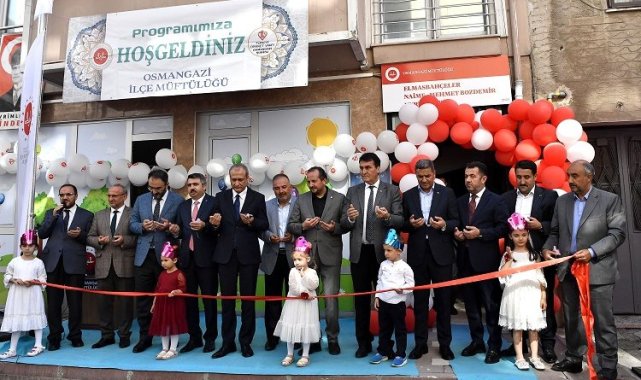 BURSA (İGFA) - Milli Emlak Müdürlüğü'ne ait olan binanın Diyanet İşleri'ne devredilmesinin ardından Hayırsever Hüseyin ve İbrahim Bozdemir tarafından anne ve babaları adına yaptırdıkları Elmasbahçeler Naime-Mehmet Bozdemir Kur'an Kursu'nun açılışına Başkan Dündar'ın yanı sıra; AK Parti Bursa Milletvekili Refik Özen, Osmangazi Kaymakamı Ali Partal, Yıldırım Belediye Başkanı Oktay Yılmaz, Bursa İl Müftüsü Yavuz Selim Karabayır, Osmangazi İlçe Müftüsü Mehmet Uzun ile çok sayıda vatandaş katıldı. Kur'an-ı Kerim tilaveti ile başlayan programda, Kur'an kursunda eğitime başlayan çocuklar öğrendikleri dualar ve ilahileri okudu.