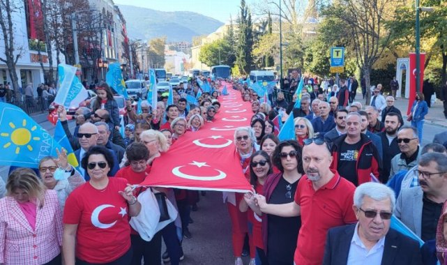 İYİ Parti Bursa İl Başkanlığı'nın Cumhuriyet Bayramı kutlaması renkli görüntülere sahne oldu.BURSA (İGFA) - 99. Yıl onuruna 99 metre uzunluğundaki dev Türk Bayrağı ile yürüyüş yapan İYİ Partilililer, Atatürk Anıtı'na çelenk sunarak Cumhuriyet'e bağlılık yemini ettiler.İl Başkanı Selçuk Türkoğlu yaptığı konuşmada, "Bu zulüm iktidarının yıktığı Cumhuriyet değerlerimizi yeniden bir bir inşa edeceğiz" dedi."Yerle yeksan edilen adaleti, okunmaz hale getirilen hukuku, tarumar edilen hak ve özgürlükleri, İstibdat zihniyetiyle yok edilen ifade, düşünce ve basın hürriyetini yeniden tesis edeceğiz" diyen Başkan Türkoğlu, "İşte bugün Bursa'da başımızın üstünde taşıyarak yürüdüğümüz şanlı bayrağımıza üzerine yemin olsun ki, and olsun Türkiye Cumhuriyeti'ni ilelebet yaşatmak için var gücümüzle çalışacağız" diye konuştu.