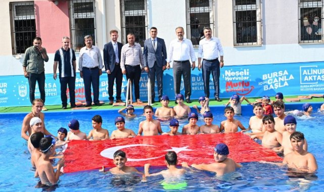 Bursa Büyükşehir Belediyesi'nin geçtiğimiz sene başlattığı 'Neşeli Havuzlar Mutlu Çocuklar' projesiyle bu yaz tatilinde de okul bahçeleri adeta tatil köyüne dönüştürüldü. 5 ilçedeki 5 okul bahçesine portatif yüzme havuzları kurulurken, çocuklar doyasıya eğlencenin tadını çıkarıyor.BURSA (İGFA) - Bursa'da geçtiğimiz yaz başlatılan ve vatandaşlardan büyük ilgi gören 'Neşeli Havuzlar Mutlu Çocuklar' projesi, bu yaz döneminde de 5 ilçedeki 5 okul bahçesine portatif yüzme havuzları kurularak devam etti.Proje kapsamında Osmangazi'de İnönü Ortaokulu, Nilüfer'de Ahmet Uyar İlkokulu, Yıldırım'da Gülhanım Karasu İlkokulu, Mudanya'da İkbal-Betül Ali İhsan Çilingiroğlu Ortaokulu ve Gemlik'te Şehit Mehmet Koray Pınar Ortaokulu bahçesine portatif yüzme havuzları kuruldu.Dönem boyunca 3 farklı gruptan oluşan 6-13 yaş aralığındaki 5 bin çocuğa 'uzman eğitmenler eşliğinde' ücretsiz temel yüzme eğitimi verilecek. 18 Temmuz'da başlayan eğitimler 31 Ağustos'a kadar devam edecek.Yıldırım'da Gülhanım Karasu İlkokulu bahçesinde kurulan yüzme havuzunu ziyaret eden Bursa Büyükşehir Belediye Başkanı Alinur Aktaş, Yıldırım Belediye Başkanı Oktay Yılmaz ile birlikte çocuklar ve aileleriyle sohbet etti. Büyükşehir Belediye Başkanı Alinur Aktaş ile fotoğraf çektiren vatandaşlar, çocuklar için yürütülen projeden dolayı teşekkür etti. ."ÇOCUKLARIMIZ İÇİN NE YAPSAK AZ"'Neşeli Havuzlar Mutlu Çocuklar' projesinden bu yıl 5 binden fazla çocuğun istifade ettiğini söyleyen Başkan Alinur Aktaş, sporu tabana yayabilmek ve çocukların sporla büyümesini sağlamak adına çalıştıklarını belirtti.15 Temmuz'da başlayan etkinlik, 31 Ağustos'a kadar devam edeceğini kaydeden Başkan Aktaş, projede emeği geçen herkese teşekkür ederek, "Çocuklarımız için ne yapsak az" dedi.Yıldırım Belediye Başkanı Oktay Yılmaz da, ilçe genelinde çocukların ve gençlerin sporla buluşabilmesi adına birçok projeyi sürdürdüklerini dile getirdi.