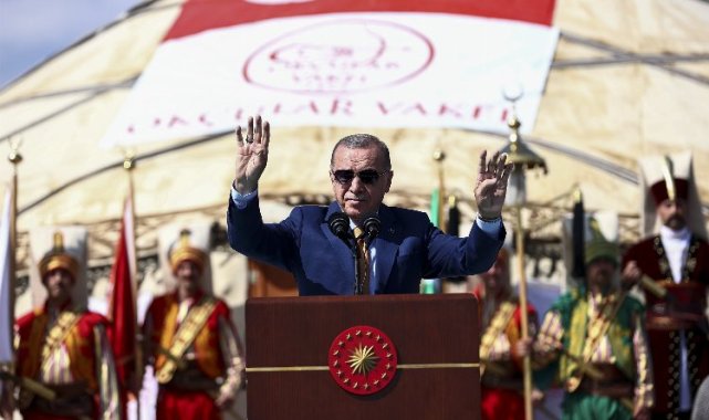 Cumhurbaşkanı Recep Tayyip Erdoğan, Malazgirt Zaferi'nin 951. yıl dönümü dolayısıyla Ahlat'ta düzenlenen etkinliklere katıldı. Terörle mücadele konusunda mesajlar veren Erdoğan, "Bir gece ansızın gelebiliriz hem de her yere gelebiliriz" dedi.ANKARA (İGFA) - Cumhurbaşkanı Erdoğan, Malazgirt Zaferi'nin 951. yıl dönümü dolayısıyla Ahlat'ta düzenlenecek etkinliklere katılmak üzere geldiği Muş Sultan Alparslan Havalimanı'nda törenle karşılandı.Ahlat'ta vatandaşlara hitap eden Cumhurbaşkanı Erdoğan, "Elbette herkes inanmak zorunda değil. Her şey gibi iman da bir nasip meselesidir." dedi."Kıyısında kurulduğu Van Gölü ile batısındaki Nemrut ve doğusundaki Süphan Dağları ile bağrında muhafaza ettiği Selçuklu yadigarı mezarlıkları ve daha nice güzellikleriyle Ahlat maziden atiye kurduğumuz köprünün kilit taşlarından biridir" diyen Cumhurbaşkanı Erdoğan, Avrupa'nın kendi içindeki barbarlığın zirveye ulaştığı, dini amaçlı görünen ama aslında tamamen yağma niyetli haclı seferleriyle oluk oluk kan döktüğü, doğudan batıya bir medeniyet göçünün yaşandığı çağlarda Ahlat bölgesinin parlayan yıldızı olarak öne çıktığını söyledi.https://youtu.be/e_DI8kIsYEgGeçen 20 yılda Türkiye'ye kazandırılan her yardımı, inşa ettiğimiz her eseri, vatandaşlarımıza sunduğumuz her hizmeti işte bu anlayışla hayata geçirdiklerini belirten Erdoğan, "Biz bu ülkedeki her bir ferdin geleceğine güvenle bakabilmesi için vizyonlarımızı genişletiyor, derinleştiriyor, büyütüyoruz. Yaklaşık 11 yıl önce bu vizyonun adına 2023 demiştik. Bugün 2053 diyoruz, yarın 2071 diyerek yolumuza devam edeceğiz" diye konuştu."BİR GECE ANISIZ GELEBİLİRİZ HEM DE HER YERE..."Terörle mücadele konusunda da mesajlar veren Cumhurbaşkanı Erdoğan, "Ülkemizin güvenlik önceliklerine, kendi planlamamıza göre operasyonları sürdüreceğiz. Bir gece ansızın gelebiliriz hem de her yere gelebiliriz. Terör örgütlerinin başını ezmeye devam ediyoruz. Gabar'da, Tendürek'te ezdik, ezmeye devam ediyoruz. Güney sınırlarımızı 30 kilometre derinliğinde bir koridorla güvence altına alana kadar mücadelemizin bitmeyeceğini tüm dünyaya bir kez daha ilan ediyorum" dedi.