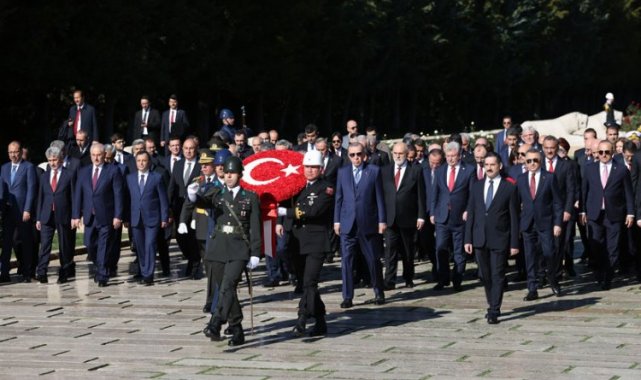Cumhurbaşkanı Recep Tayyip Erdoğan, 29 Ekim Cumhuriyet Bayramı'nın 99. yıl dönümü kutlamaları çerçevesinde Anıtkabir'de düzenlenen törene katıldı.ANKARA (İGFA) - Cumhurbaşkanı Erdoğan'ın Aslanlı Yol'un başındaki yerini almasının ardından başlayan törende; Türkiye Büyük Millet Meclisi Başkanı Mustafa Şentop, Cumhurbaşkanı Yardımcısı Fuat Oktay, CHP Genel Başkanı Kemal Kılıçdaroğlu, MHP Genel Başkanı Devlet Bahçeli, İYİ Parti Genel Başkanı Meral Akşener, Cumhurbaşkanlığı Kabinesi üyeleri, yüksek yargı organlarının başkanları, Genelkurmay Başkanı Orgeneral Yaşar Güler ve kuvvet komutanları da Aslanlı Yol'dan geçerek mozoleye çıktı.
