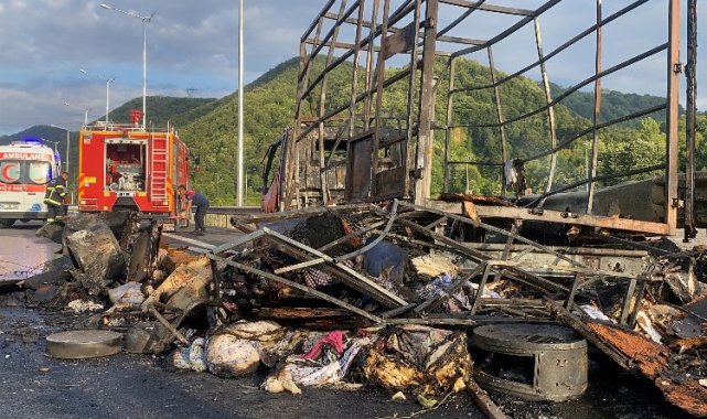 Düzce'de Anadolu Otoyolunda ev eşyası taşıyan kamyonet yandı.