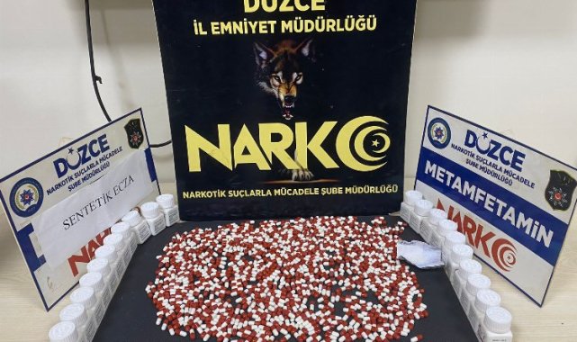 Düzce'de durdurulan şüpheli araçtaki iki şahıs 'uyuşturucu madde ticareti' yapmak suçundan sevk edildiği mahkemece tutuklandı.DÜZCE (İGFA) - Düzce Cumhuriyet Başsavcılığı'nın uyuşturucu madde ticareti yapmak suçu kapsamında yürütülmekte olan soruşturması kapsamında İl Emniyet Müdürlüğü Asayiş Şube Müdürlüğü ekipleri, Kültür Mahallesi üzerinde 81 ACS 854 plakalı aracı şüphe üzerine durdurdu.Araçtan inen M.T ve Ö.İ adlı şahısların üzerinde yapılan aramada; 840 adet Sentetik ecza, 3 gr. Metamfetamin ele geçirildi.Alınan bilgiye göre, Narkotik Suçlarla Mücadele Şube Müdürlüğü tarafından şüpheli şahıslar hakkında 'Uyuşturucu Madde Ticareti Yapmak' suçundan işlem başlatıldı.Gözaltına alınan şüpheliler sevk edildikleri adli makamlarca tutuklanarak cezaevine gönderildi.