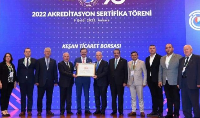 Keşan Ticaret Borsası'nın 5 yıldızlı hizmet kalitesi, akreditasyon sistemi denetimi ile bir kez daha tescillendi. Keşan, Akreditasyon Sertifikası'n ıtörenle Türkiye Odalar ve Borsalar Birliği Başkanı M. Rifat Hisarcıklıoğlu ile Akreditasyon Kurulu Başkanı Faik Yavuz'un elinden aldı.