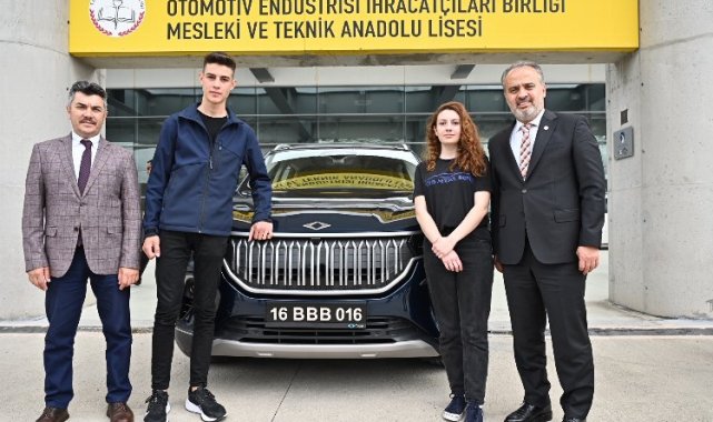 Bursa’da okulun atölyesinde şarj süresi 4 saat olan ve tam şarjla 60 kilometre yol kat eden elektrikli araç üreten Otomotiv Endüstrisi İhracatçıları Birliği Mesleki ve Teknik Anadolu Lisesi öğrencileri, Türkiye’nin gururu Togg’la buluştu.