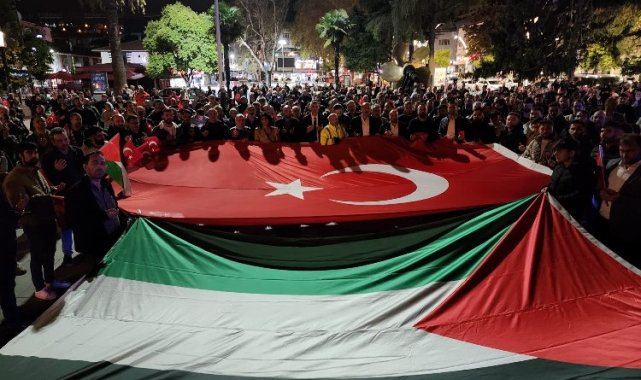 İsrail'in 500 kişinin yaşamını yitirmesine neden olan Gazze'deki El-Ehli Baptist Hastanesi'ne yönelik bombalı saldırısına tepki gösteren Gölcüklüler, Anıtpark’ta Filistin için tek yürek oldular.