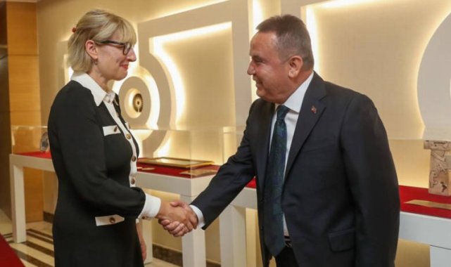 İngiltere Büyükelçisi Jill Morris, Antalya Büyükşehir Belediye Başkanı Muhittin Böcek'i ziyaret etti. Türkiye ile İngiltere arasındaki ilişkilerin ele alındığı görüşmede başta turizm, tarım ve ticaret olmak üzere her alandaki işbirliğinin daha da ileri seviyeye taşınması noktasında yapılabilecekler ele alındı.ANTALYA (İGFA) - Antalya Büyükşehir Belediye Başkanı Muhittin Böcek, Antalya'yı ziyaret eden İngiltere Büyükelçisi Jill Morris'i makamında ağırladı. Büyükelçi Morris'in ziyaretinde Antalya Büyükşehir Belediyesi Genel Sekreteri Cansel Tuncer, Genel Sekreter Yardımcısı Mustafa Gürbüz ile Başkan Danışmanları Osman Ayık ve Lokman Atasoy da hazır bulundu.BAŞKAN BÖCEK ANTALYA HAKKINDA BİLGİ VERDİ"Her türlü ticari ve ekonomik işbirliğine hazırız" diyen Başkan Muhittin Böcek, Büyükelçi Morris'e Antalya'nın tarım ve turizm potansiyeli hakkında bilgi verdi. Antalya'da deniz, kum ve güneşin yanı sıra turistlere yönelik sağlık turizminin de ön planda olduğunu söyleyen Başkan Muhittin Böcek, "Antalya'da turizmin yanı sıra verimli topraklar vardır. Tarım da en önemli sektörümüzdür. Türkiye'nin sebze, meyve ihtiyacının yüzde 50'si Antalya'dan karşılanmaktadır. Antalya Büyükşehir Belediyesi olarak üreticilere elektrik enerjilerinin yüze 85'ini ödüyoruz. Tohum, fide, fidan desteği sağlıyoruz. İngiltere'den kentimize gelen turist sayısının artmasını isteriz" dediİNGİLİZ HALKI ANTALYA'DA ÇOK MUTLUTürkiye'de ve Antalya'da olmaktan mutluluk duyduğunu belirten İngiliz Büyükelçi Morris de İngiliz halkının Antalya'da çok mutlu olduğunu ve burayı çok sevdiğini belirtti. Büyükelçi Morris, "İngiliz vatandaşlarımıza göstermiş olduğunuz yakın ev sahipliği için teşekkür etmek istiyorum. Antalya'da o kadar mutlular ve o kadar entegre olmuşlar ki hiçbir şikayet ya da olumsuz dönüş almıyoruz" diye konuştu.ÇEVRE PROJELERİ ANLATILDIAntalya Büyükşehir Belediyesi'nin çevre ile ilgili projelerini merak eden Büyükelçi Morris'e Antalya Büyükşehir Belediyesi Başkan Danışmanı Lokman Atasoy belediyenin bu alanda yaptığı çalışmalar hakkında bilgi verdi.