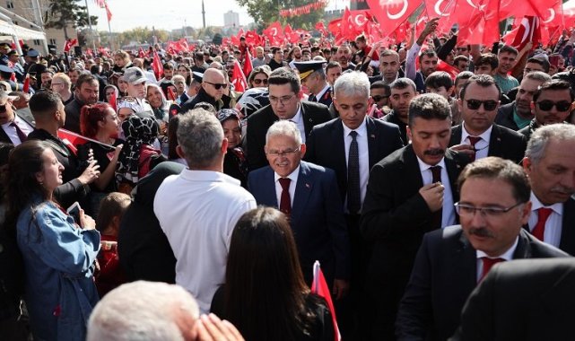Gazi Mustafa Kemal Atatürk önderliğinde aziz şehitler, gaziler ve yaşlı, kadın, erkek, çocuk demeden bir millet tarafından kazanılan İstiklal Harbi'nin ardından kurulan Türkiye Cumhuriyeti'nin kuruluş günü olan 29 Ekim Cumhuriyet Bayramı, tüm yurtta olduğu gibi Kayseri'de de coşkuyla kutlandı.Cumhuriyet Meydanı'nda düzenlenen resmi kutlamalara, Büyükşehir Belediye Başkanı Dr. Memduh Büyükkılıç da katıldı. İlk olarak Kayseri Valisi Gökmen Çiçek, Garnizon Komutanı Hv. Tuğg. Haldun Taşan ve Büyükşehir Belediye Başkanı Dr. Memduh Büyükkılıç, valilik makamında tebrikat töreninde tebrikleri kabul ederek, protokol üyeleri ile bayramlaştı.Protokol bayramlaşmasının ardından Cumhuriyet Meydanı'na geçen Vali Çiçek, Büyükşehir Belediye Başkanı Büyükkılıç ve Tuğgeneral Taşan, protokol üyelerini ve vatandaşları, meydan ve Sivas Caddesi güzergâhınca araç üzerinden selamladı.Saygı duruşunda bulunulması ve İstiklal Marşı'nın okunmasının ardından Cumhurbaşkanı Recep Tayyip Erdoğan'ın 29 Ekim Cumhuriyet Bayramı 100'üncü yıl kutlama mesajı okundu.Cumhuriyet'in 100'üncü yıl tırmanışında Gençlik ve Spor İl Müdürlüğü, Dağcılık İl Temsilciliği tarafından 100 dağcının Erciyes Dağı zirvesinde dalgalandırdığı Türk Bayrağı, dağ tırmanış ekibi tarafından Vali Çiçek'e teslim edildi. Programda, öğrenciler duygu dolu şiirler okurken, gençler halk oyunları, tiyatro, karate ve 100'üncü yıl gösterisi yaptı. Törende, kulüpler arasında gerçekleşen turnuvalara ödül takdimi, Başkan Büyükkılıç'ın da yer aldığı protokol tarafından yapıldı.Büyükşehir Belediye Bandosu tarafından konser de verilen kutlama programı, tören geçişi ile devam etti. Ay yıldızlı Türk bayrağı ile öğrencilerin, izcilerin, gazilerin, bisikletlilerin, AFAD'ın, Kızılay'ın, atlı birliklerin, Büyükşehir İtfaiyesi'nin, kahraman askerlerin ve polislerin geçişi büyük ilgiyle izlendi.TÜRKİYE VE KAYSERİ'NİN MEDAR-I İFTİHARLARI "KOCA YUSUF"LAR GÖKLERDEAyrıca vatan için çırpınan kanatlarıyla Türkiye ve Kayseri'nin medar-ı iftiharları 12'nci Hava Ulaştırma Ana Üs Komutanlığı'na ait kargo ve nakliye A400M, namı diğer Koca Yusuf uçakları da Cumhuriyet Meydanı'nda yakın uçuş yaparak, muhteşem bir görsel şölen sundu. 2'nci Hava Bakım Fabrika Müdürlüğü tarafından üretilen ilk ve tek milli uçak çeker aracı Rahvan, yine ilk ve tek üretilen bomba yükleme cihazı Seyit Onbaşı da kortejde geçiş yaptı.Muhteşem bir geçit töreni düzenlendiğini söyleyen Büyükşehir Belediye Başkanı Dr. Memduh Büyükkılıç, nice 100 yıllar temennisinde bulunarak, "Canları pahasına vatanlarını savunarak bu cennet vatanı bize armağan eden, başta Cumhuriyet'imizin kurucusu Gazi Mustafa Kemal Atatürk olmak üzere kahraman ecdadımızı ve aziz şehitlerimizi rahmetle anıyorum. Cumhuriyet Bayramı'mız kutlu olsun. Nice 100'lü yıllara" diye konuştu. Törende vatandaşların sıcak ve samimi ilgisiyle karşılaşan Başkan Büyükkılıç, başta çocuklar ve gençler olmak üzere bol bol Kayserililerle günün anısına hatıra fotoğrafı çektirdi.