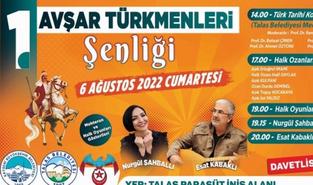 Avşar Türkmenleri, Kayseri Büyükşehir ve Talas Belediyeleri ile Dünya Avşarlar Derneği tarafından ortaklaşa düzenlenecek şenlikte bir araya geliyor.Mehmet UZEL (KAYSERİ İGFA)
