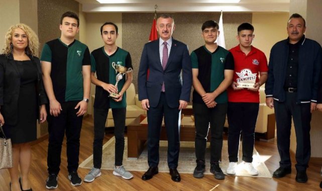 Kocaeli Büyükşehir Belediye Başkan Tahir Büyükakın, robot yarışmalarında dereceye öğrenci ve öğretmenlerini makamında konuk etti