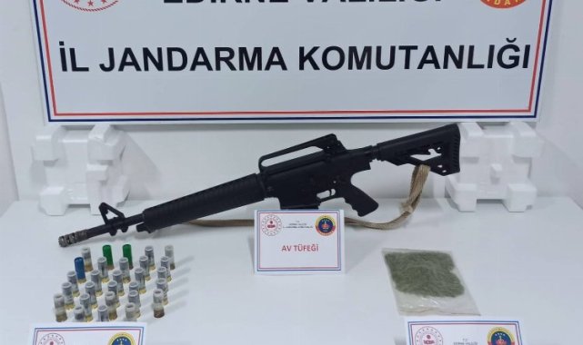 Edirne İl Jandarma Komutanlığı, kaçakçılık olaylarına yönelik çalışmalarını sürdürüyor.Erdoğan DEMİR / EDİRNE (İGFA) - KOM Şube Müdürlüğünce elde edilen bilgiler neticesinde KOM ve Asayiş Timlerince müşterek yapılan faaliyette Edirne'NİN Lalapaşa ilçesinde ikamet eden H.Y. isimli şahsın ev ve eklentilerinde adli makamlardan alınan arama kararı gereğince arama yapıldı.Evde yapılan aramada 18 gram esrar maddesi, 1 adet ruhsatsız otomatik av tüfeği, 1 adet şarjör, 31 adet fişek ele geçirildi.Şüpheli H.Y., işlemlerinin ardından adli makamlara sevk edildi.