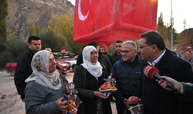 Kayseri Valisi Gökmen Çiçek ile Kayseri Büyükşehir Belediye Başkanı Dr. Memduh Büyükkılıç kentin önemli turizm değeri olan Yeşilhisar ilçesi Soğanlı Vadisi bölgesinde balon turizmi kapsamında Türk Bayrağı figürlü özel uçuşa katıldı. Balon uçuşuna yöresel kıyafetler taşıyan, 60 yıllık bir hikâyesi olan el emeği, göz nuru Soğanlı oyuncak bez bebekleri üreten kadınlar da katıldı."ABLALARIMIZIN 5-6 DİLDE TURİSTLERLE KONUŞUYOR OLMALARI BİZLERE GÜÇ KATTI"Burada uçuş öncesi gazetecilere açıklamalarda bulunan Vali Gökmen Çiçek, "Özellikle burada ablalarımızın da turizme verdikleri katkı, 5-6 dilde turistlerle konuşuyor olmaları bizlere güç kattı. İnşallah herkesi Soğanlı'daki bu muhteşem ortama bekliyoruz" dedi."TURİZMDE BÜYÜK PATLAMA OLACAK"Soğanlı bebeklerinin, geleneksel kıyafetler içerisinde geleneksel bir kültür olduğuna dikkat çeken Vali Çiçek, "Kadın kooperatifi kurdular. Turistler çok ciddi rağbet gösteriyor. Turizmin gelişmesi için kendilerini geliştiren, gelen turistler ile iletişim kurması için dil noktasında çalışan annelerimize, ablalarımıza teşekkür ediyorum. Burada onların azmi olduğu sürece turizmde büyük patlama olacak" diye konuştu."VALİ BEYİMİZİN, BÜYÜKŞEHİR BELEDİYE BAŞKANIMIZIN SAYESİNDE BALONLAR GELDİ"İspanyolca ve Fransızca Soğanlı bez bebekleri satan kadınlar da "Vali beyimizin, Büyükşehir Belediye Başkanımızın sayesinde balonlar geldi, Allah razı olsun. İnsanlar çoğaldı, devamını bekliyoruz, çok memnunuz. Kadın kooperatifimizi de kuruyoruz" ifadelerini kullandılar."Ablalarımız burasının temel taşlarıdır" diyen Başkan Büyükkılıç ise, 5-6 farklı dil bilen, yöresel bez bebek satışı yapan kadınlarla bir süre Fransızca konuşarak, sohbet etti.