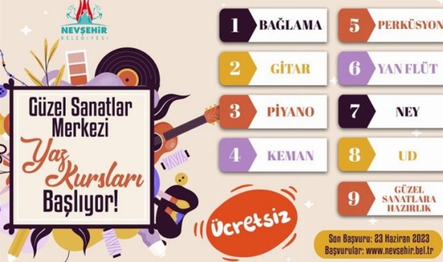 Sınırlı kontenjanlarla hafta içi ve hafta sonu açılması planlanan kurslara katılmak isteyenler 23 Haziran 2023 tarihine kadar, Kültür Park içerisinde bulunan Nevşehir Belediyesi Güzel Sanatlar Merkezi'ne veya Paşakonağı'ndaki Nevşehir Belediyesi Gençlik ve Spor Hizmetleri Müdürlüğü'ne şahsen başvurabilecekleri gibi www.nevsehir.bel.tr adresindeki hızlı menü içerisinde bulunan Gençlik ve Spor Hizmetleri Müdürlüğü Kurs Başvuruları sekmesinden online olarak kayıtlarını yaptırabilecek.