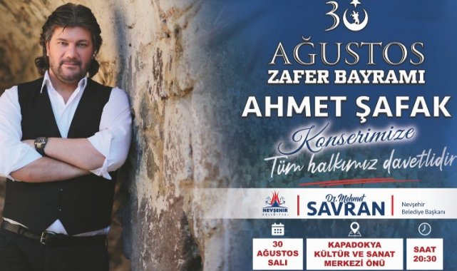 Nevşehir'de 30 Ağustos Zafer Bayramı'nın 100. yıl dönümü dolayısıyla düzenlenecek konserde ünlü sanatçı Ahmet Şafak sahne alacak.Mehmet UZEL (NEVŞEHİR İGFA)