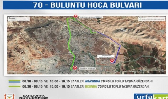 Şanlıurfa Büyükşehir Belediyesi, Buluntu Hoca Bulvarı ile Zeytindalı Eğitim Kampüsüne yeni hat seferleri 10 Ekim Pazartesi başlayacak.ŞANLIURFA (İGFA) - Yeni hatla birlikte Buluntu Hoca Bulvarından başlayan sefer Zeytindalı Eğitim kampüsüne kadar sürecek.Şanlıurfa Büyükşehir Belediyesi Ulaşım Hizmetleri Daire Başkanlığı 70 nolu Buluntu Hoca Bulvarı hattımız 10.10.2022 tarihi itibariyle toplu taşıma seferlerine başlayacak. Ayrıca Zeytindalı Eğitim Kampüsüne Sefer Saatleri; Aktarma Merkezinden : 06:30 ile 08:15 saatleri arası Aktarma merkezinden hareket eden araçların Son Durak noktası Zeytindalı Eğitim Kampüsü Zeytindalı Eğitim Kampüsünden: 15:00 ile 16:15 saatleri arası Haraket eden araçların hatta başlangıç noktası Zeytindalı Eğitim Kampüsü " olacaktır.