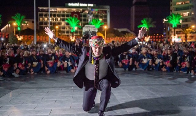 İzmir'de 29 Ekim Cumhuriyet Bayramı coşkusu zeybek gösterisi, fener alayı ve konserlerle sürdü. İzmir Büyükşehir Belediye Başkanı Tunç Soyer Cumhuriyet Meydanı'nda 9 ilçeden 200 zeybekle Ata'nın huzurunda diz vurdu. 350 metrelik Türk bayrağının taşındığı fener alayıyla Kordonboyu'ndan Kültürpark'a yürüyen Başkan Soyer, çim alanda konser için toplanan İzmirlilerin bayramını kutladı.İZMİR (İGFA) - İzmir Büyükşehir Belediyesi düzenlediği etkinliklerle Cumhuriyet gururunu tüm kente yaydı. Kentteki coşku akşam saatlerinde doruğa çıktı. Cumhuriyet Meydanı'nda 9 ilçede 200 zeybek tarafından yapılan gösteriye İzmir Büyükşehir Belediye Başkanı Soyer de katıldı. Alkışlarla efeler arasındaki yerini alan Başkan Tunç Soyer, Atasının huzurunda diz vurdu.