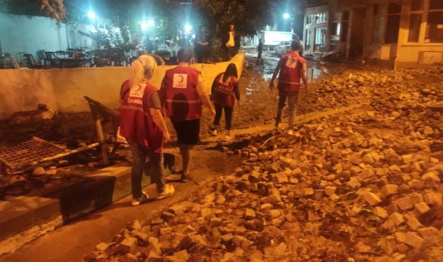 Bursa'nın Mudanya ilçesinde 31 Ağustos'ta etkili olan şiddetli yağış, sele neden oldu. 2 gün boyunca selin yaralarını sarmak için çalışmaların sürdüğü bölgede, Türk Kızılay Bursa ve Mudanya şubeleri, sahada çalışan ekiplere ve 2 bin 500 vatandaşa, yemek, su ve sıcak içecek dağıtımı gerçekleştirdi.BURSA (İGFA) - Bursa'da 31 Ağustos günü öğle saatlerinde başlayan şiddetli yağış nedeniyle bazı bölgelerde sel felaketi yaşandı. Yağışın en yoğun olduğu Mudanya'da kara ve denizin birleşmesiyle otomobiller sel suların altında kalırken, bazı ev ve dükkanları su bastı. Olaya müdahale eden BUSKİ, AFAD ve itfaiye ekiplerini Türk Kızılay Bursa ve Mudanya Şubeleri de yalnız bırakmadı. Kızılay'da görevli olan Yönetim Kurulu ve gönüllü üyelerden oluşan 30 kişilik ekip, 31 Ağustos-2 Eylül tarihleri arasında bölgede görev yapan ekiplere ve vatandaşlara yemek, su ve sıcak içecek dağıtımı yaptı. Kızılay ekipleri hayatın normale dönmesinin ardından bölgeden ayrıldı.