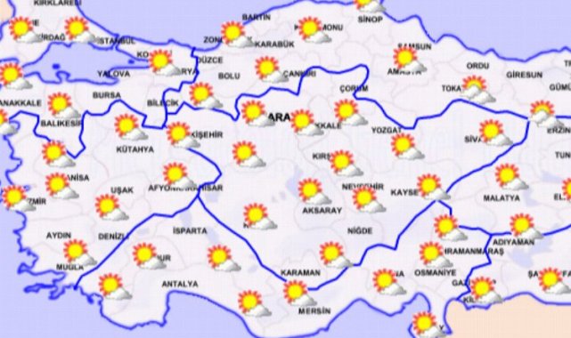 Az bulutlu ve açık, zamanla parçalı bulutluANTALYA °C, 28°CAz bulutlu ve açık, zamanla parçalı bulutlu , öğle saatlerinden sonra iç kesimleri yerel olmak üzere sağanak ve gök gürültülü sağanak yağışlıHATAY °C, 30°CAz bulutlu ve açık, zamanla parçalı bulutluISPARTA °C, 27°CAz bulutlu ve açık, zamanla parçalı bulutlu , öğle saatlerinden sonra yerel olmak üzere sağanak ve gök gürültülü sağanak yağışlıİÇ ANADOLUParçalı ve az bulutlu, kuzeybatısı zamanla çok bulutlu, Ankara, Çankırı ve Kırıkkale çevrelerinin sağanak ve yer yer gök gürültülü sağanak yağışlı geçeceği tahmin ediliyor.ANKARA °C, 26°CParçalı ve az bulutlu, yerel sağanak ve gök gürültülü sağanak yağışlıÇANKIRI °C, 28°CParçalı ve az bulutlu, yerel sağanak ve gök gürültülü sağanak yağışlıESKİŞEHİR °C, 27°CParçalı ve az bulutluKONYA °C, 29°CParçalı ve az bulutluBATI KARADENİZParçalı ve çok bulutlu, bölge genelinin (Sinop hariç) sağanak ve yer yer gök gürültülü sağanak yağışlı geçeceği tahmin ediliyor.BOLU °C, 25°CParçalı ve çok bulutlu, yerel sağanak ve gök gürültülü sağanak yağışlıDÜZCE °C, 28°CParçalı ve çok bulutlu, yerel sağanak ve gök gürültülü sağanak yağışlıKASTAMONU °C, 24°CParçalı ve çok bulutlu, yerel sağanak ve gök gürültülü sağanak yağışlıSİNOP °C, 26°CParçalı ve çok bulutluORTA ve DOĞU KARADENİZParçalı ve az bulutlu, iç kesimleri yerel olmak üzere sağanak ve gök gürültülü sağanak yağışlı geçeceği tahmin ediliyor.AMASYA °C, 30°CParçalı ve az bulutlu, yerel olmak üzere sağanak ve gök gürültülü sağanak yağışlıARTVİN °C, 25°CParçalı ve az bulutluSAMSUN °C, 26°CParçalı ve az bulutluTRABZON °C, 25°CParçalı ve az bulutlu, iç kesimleri yerel olmak üzere sağanak ve gök gürültülü sağanak yağışlıDOĞU ANADOLUParçalı ve az bulutlu geçeceği tahmin ediliyor.ERZURUM °C, 25°CParçalı ve az bulutluKARS °C, 25°CParçalı ve az bulutluMALATYA °C, 30°CParçalı ve az bulutluVAN °C, 24°CParçalı ve az bulutluGÜNEYDOĞU ANADOLUAz bulutlu ve açık geçeceği tahmin ediliyor.DİYARBAKIR °C, 34°CAz bulutlu ve açıkGAZİANTEP °C, 33°CAz bulutlu ve açıkSİİRT °C, 33°CAz bulutlu ve açıkŞANLIURFA °C, 35°CAz bulutlu ve açıkDENİZLERDE HAVAAkdeniz'de fırtınamsı rüzgar bekleniyor.KARADENİZHava Durumu: Parçalı ve çok bulutlu, Batı Karadeniz'in doğusu sağanak ve yer yer gök gürültülü sağanak yağışlı, Rüzgar: Batı Karadeniz'de güney ve güneybatı, doğusu güneydoğudan, Doğu Karadeniz'de doğu ve güneydoğudan 3 ila 5 kuvvetinde, Dalga: 1,0 ila 2,0m, Görüş: İyi, yağış anında orta.MARMARAHava Durumu: Parçalı ve çok bulutlu, Rüzgar: Güney ve güneybatıdan 3 ila 5, ilk saatlerde 6 kuvvetinde, Dalga: 1,0 ila 2,0m, Görüş: İyi.EGEHava Durumu: Parçalı ve çok bulutlu, güneyi sağanak ve yer yer gök gürültülü sağanak yağışlı Rüzgar: Güney ve güneybatı, zamanla güneydoğudan 3 ila 5, kuzeyi ilk saatlerde 6 kuvvetinde, Dalga: 1,0 ila 2,0m, ilk saatlerde kuzeyi 2,5m Görüş: İyi, yağış anında orta.AKDENİZHava Durumu: Parçalı ve çok bulutlu, Rüzgar: Batı Akdeniz'de batı ve güneybatıdan, batısı kuzeybatıdan 3 ila 5, batısı öğle saatlerinden itibaren 5 ila 7, Doğu Akdeniz'de batı ve güneybatıdan 3 ila 5, batısı 4 ila 6, öğle saatlerinden itibaren 7 kuvvetinde, Dalga: 1,0 ila 2,0m, yer yer 3,0m, Görüş: İyi.VAN GÖLÜHava Durumu: Az bulutlu ve açık; Rüzgar: Batı ve kuzeybatıdan 2 ila 4 yer yer 5 kuvvetinde; Dalga: 0,50 ila 0,75 m; Görüş: İyi.