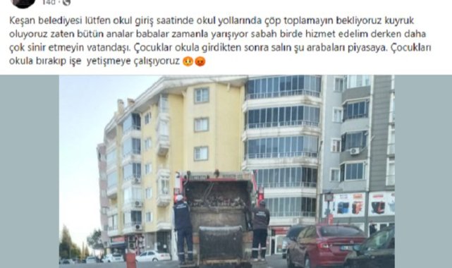 Pınar Ayaz adlı vatandaşın sosyal medya Facebook Sitesi'nden yaptığı paylaşım şöyle; "Keşan Belediyesi lütfen okul giriş saatinde okul yollarında çöp toplamayın, bekliyoruz kuyruk oluyoruz.Zaten bütün analar babalar zamanla yarışıyor, sabah bir de hizmet edelim derken daha çok sinir etmeyin vatandaşı. Çocuklar okula girdikten sonra salın şu arabaları piyasaya. Çocukları okula bırakıp işe yetişmeye çalışıyoruz."