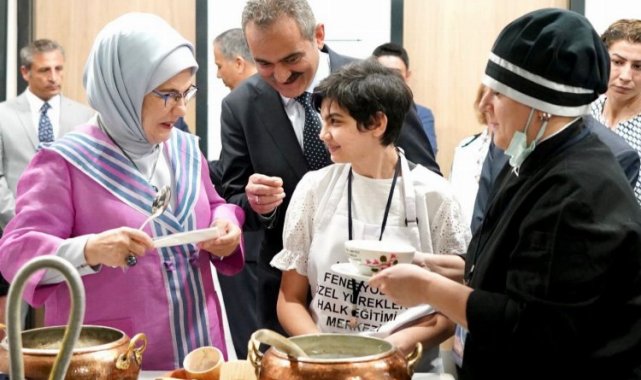 Cumhurbaşkanı Recep Tayyip Erdoğan'ın eşi Emine Erdoğan ve Millî Eğitim Bakanı Mahmut Özer, Türkiye'de 18 yaş üzeri yetişkin engellilere yönelik hizmete alınan ilk Halk Eğitimi Merkezi (HEM) olan Feneryolu Özel Yürekler HEM'in açılışını gerçekleştirdi.İSTANBUL (İGFA) - Özel eğitime ihtiyacı olan 18 yaş üstü yetişkin bireyler için açılan "Feneryolu Özel Yürekler Halk Eğitimi Merkezi" açılışında Erdoğan ve Özer, ilk olarak yiyecek içecek atölyesini ziyaret etti. Hafif düzey zihinsel engelli öğrencilerin şeflerinden yaptıkları çalışmalarla ilgili bilgi alan Erdoğan, sohbet ettiği öğrencilerin hazırladığı soğuk ayran aşı çorbasını tattı.Buradan hafif otizm tanılı öğrencilerin spor ve fiziksel aktivitelerde bulunduğu alana gelen Erdoğan, masa tenisi oynayan öğrencileri izledi. Erdoğan, masa tenisindeki başarılarından dolayı öğrencileri tebrik etti.Emine Erdoğan, daha sonra orta-ağır tanılı zihinsel engelli bireylerin tarıma ilişkin eğitim aldığı atölyeyi ziyaret etti. Öğrenciler ve öğretmenleriyle sohbet eden Erdoğan, 22 yaşındaki Aziz Batuhan Ateş ile teraryum yaptı.Ateş ve Erdoğan, elleriyle kalp yaparak birbirlerine sevgilerini dile getirdi. Erdoğan ve öğrenciler, bu neşeli sohbetlerini el sallayarak tamamladı.Bu arada Erdoğan, Bakan Özer ile merkezde atık malzemeler kullanılarak oluşturulan sıfır atık kütüphanesini de inceledi. Müzik akademisi öğrencileri, besteledikleri "Özel Yürekler" parçasını Erdoğan için söyledi Cumhurbaşkanı Recep Tayyip Erdoğan'ın eşi Emine Erdoğan, özel eğitim müzik akademisi öğrencileriyle de bir araya geldi.Öğrenciler, öğretmenleriyle besteledikleri "Özel Yürekler" parçasını enstrümanlar eşliğinde Erdoğan için seslendirdi. Erdoğan, burada görme engelli öğrenci Mert Özer'in piyano eşliğinde seslendirdiği "Neyleyim İstanbul'u" parçasını da dinledi. Burada Erdoğan'ı otizmli Samet Zileli, piyano çalarak karşıladı.